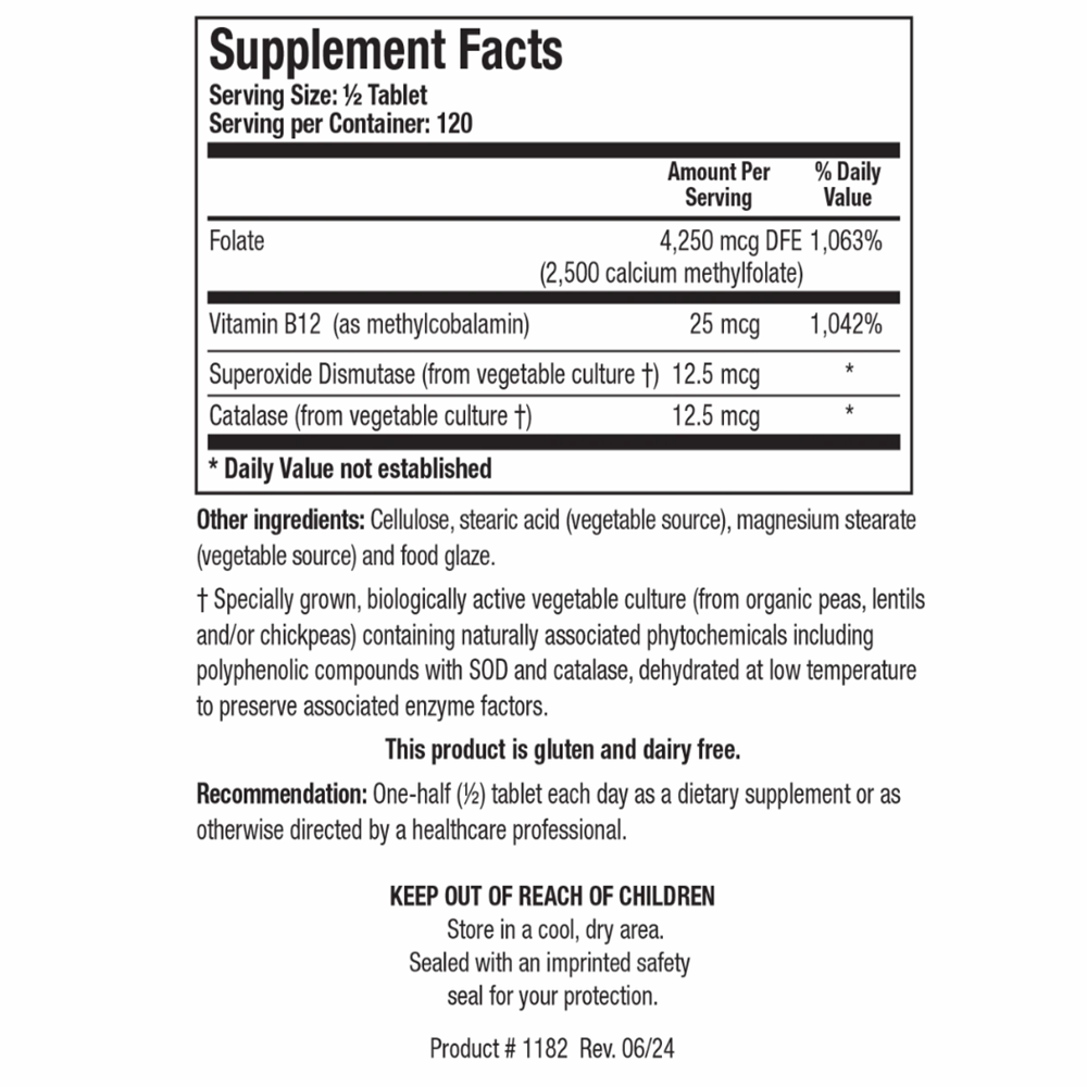 Ingredients: Folate (as (6S)-5-methyltetrahydrofolic acid, glucosamine salt), Vitamin B12 (as methylcobalamin). Vegetable culture†, methylcellulose, stearic acid (vegetable source), magnesium stearate (vegetable source) and pharmaceutical glaze.