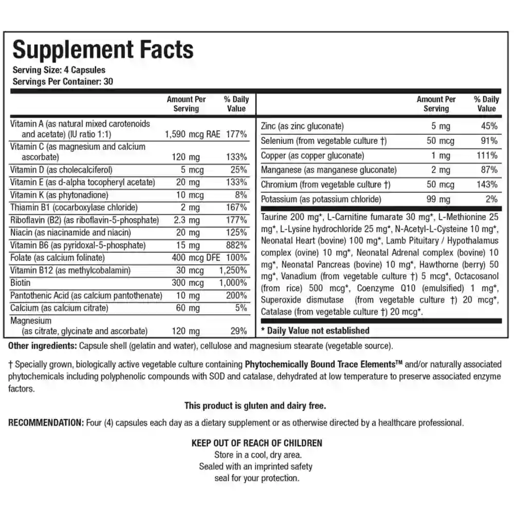 Vitamin A (as natural mixed carotenoids and palmitate), Vitamin C (as magnesium and calcium ascorbates), Vitamin D (as cholecalciferol), Vitamin E (as d-alpha tocopheryl acetate), Vitamin K (as phytonadione), Thiamin (B1) (as cocarboxylase chloride), Riboflavin (B2) (as riboflavin-5-phosphate), Niacin (as niacinamide), Vitamin B6 (as pyridoxal-5-phosphate), Folate (as calcium folinate), Vitamin B12 (as methylcobalamin), Biotin, Pantothenic Acid (as calcium pantothenate), Calcium (as calcium citrate), Magnesium (as magnesium citrate, glycinate and ascorbate), Zinc (as zinc gluconate), Selenium (raw vegetable culture), Copper (as copper gluconate), Manganese (as manganese gluconate), Chromium (raw vegetable culture), Potassium (as potassium chloride), Taurine, L-Carnitine fumarate, L-Methionine, L-Lysine HCl, N-Acetyl-L-Cysteine, Neonatal Heart (bovine), Lamb Pituitary/Hypothalamus Complex (ovine), Neonatal Adrenal Complex Concentrate (bovine), Neonatal Pancreas (bovine), Hawthorne (Crataegus oxyacanthus) (berry), Vanadium (raw vegetable culture), Octacosonol (from rice), Coenzyme Q10, Superoxide Dismutase (raw organic vegetable culture†), Catalase (raw organic vegetable culture†). †Specially grown, biologically active vegetable culture containing Phytochemically Bound Trace Elements™ and/or naturally associated phytochemicals including polyphenolic compounds with SOD and catalase, dehydrated at low temperature to preserve associated enzyme factors. “Vitamin A (as natural mixed carotenoids and palmitate), Vitamin C (as magnesium and calcium ascorbates), Vitamin D (as cholecalciferol), Vitamin E (as d-alpha tocopheryl acetate), Vitamin K (as phytonadione), Thiamin (B1) (as cocarboxylase chloride), Riboflavin (B2) (as riboflavin-5-phosphate), Niacin (as niacinamide), Vitamin B6 (as pyridoxal-5-phosphate), Folate (as calcium folinate), Vitamin B12 (as methylcobalamin), Biotin, Pantothenic Acid (as calcium pantothenate), Calcium (as calcium citrate), Magnesium (as magnesium citrate, glycinate and ascorbate), Zinc (as zinc gluconate), Selenium (raw vegetable culture), Copper (as copper gluconate), Manganese (as manganese gluconate), Chromium (raw vegetable culture), Potassium (as potassium chloride), Taurine, L-Carnitine fumarate, L-Methionine, L-Lysine HCl, N-Acetyl-L-Cysteine, Neonatal Heart (bovine), Lamb Pituitary/Hypothalamus Complex (ovine), Neonatal Adrenal Complex Concentrate (bovine), Neonatal Pancreas (bovine), Hawthorne (Crataegus oxyacanthus) (berry), Vanadium (raw vegetable culture), Octacosonol (from rice), Coenzyme Q10, Superoxide Dismutase (raw organic vegetable culture†), Catalase (raw organic vegetable culture†). †Specially grown, biologically active vegetable culture containing Phytochemically Bound Trace Elements™ and/or naturally associated phytochemicals including polyphenolic compounds with SOD and catalase, dehydrated at low temperature to preserve associated enzyme factors. Capsule shell (gelatin and water), cellulose and magnesium stearate (vegetable source). This product is gluten and dairy free.