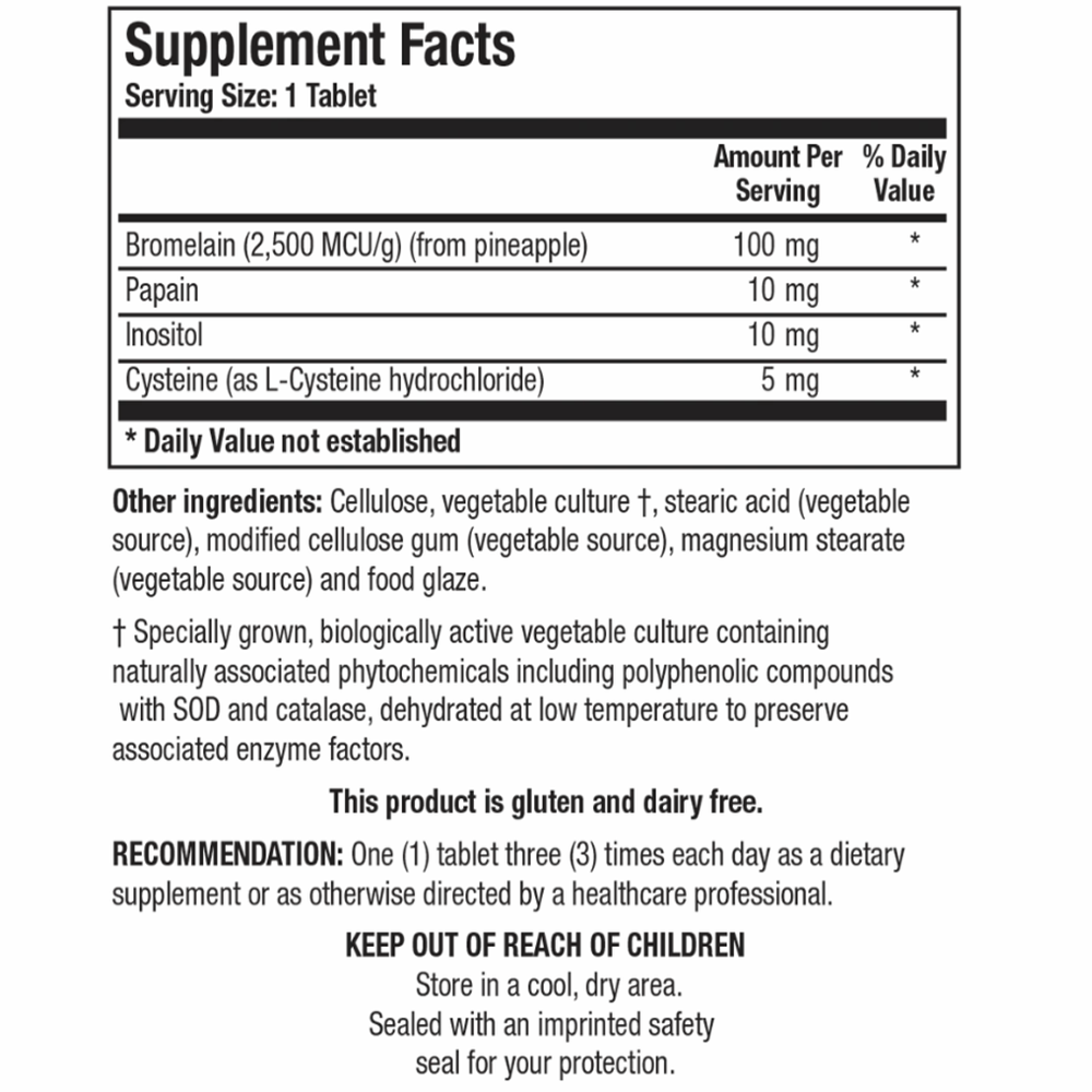 Ingredients: Bromelain (2,500 MCU/g) (from pineapple), Papain, Inositol, Cysteine (as L-Cysteine hydrochloride). Cellulose, vegetable culture†, stearic acid (vegetable source), modified cellulose gum (vegetable source), magnesium stearate (vegetable source) and food glaze. Specially grown, biologically active vegetable culture containing naturally associated phytochemicals including polyphenolic compounds with SOD and catalase, dehydrated at low temperature to preserve associated enzyme factors.